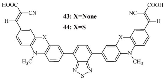 The optical and electrochemical properties of organic dyes 43 and 44 are presented in Table 10. Both organic dyes exhibited two main absorption bands in the range of 340–410 nm and 420–540 nm. It is known that a wider absorption range contributes to better DSSC performance, since it allows collecting more photons. The observed red shift in the absorption maxima of dye 44 compared with those of dye 43 may have been due to the stronger electron-donating ability of the phenothiazine unit.