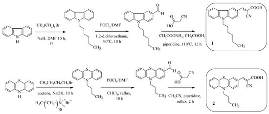 In recent years, there has been growing scientific interest in the development of new third-generation photovoltaic technologies such as dye-sensitized solar cells (DSSCs), organic solar cells (OSCs), and perovskite solar cells (PSCs), which are being developed as alternatives to silicon solar cells. Numerous studies in this area are related to the fact that these devices can compete with traditional silicon-based solar cells with their lower cost, ease of fabrication, and ability to be processed on flexible substrates [1]. However, despite the above advantages, all the mentioned solar cell technologies are not without their drawbacks. To date, OSCs have had difficulties due to the proper ordering of charge domains; PSCs suffer from their stability and sensitivity to moisture; and DSSCs require photosensitive materials with a broad absorption spectrum to demonstrate higher efficiency. In general, DSSCs have shown the best performance under practical outdoor conditions [2]. Dye-sensitized solar cells exhibit significant power generation performance throughout the day, even under low-intensity light, regardless of the incident angle of the light [3]. The photophysical characteristics of DSSCs are determined by the molecular structure of the dye. Therefore, they can be relatively easily tuned at the molecular level by varying the substituents and structural moieties. In addition, DSSCs are stable and efficient under harsh conditions such as low temperatures and low-light environments, even in the presence of moisture [4,5,6] Thus, DSSCs are still one of the most promising solar cell technologies, and research aimed at improving the efficiency of such solar cells is relevant today. Recent studies have shown that the best DSSCs based on metal-free organic dyes exhibited an energy conversion efficiency of 15.2% [7]. As is known, the efficiency of solar cells is determined by the molecular structure of the dye, which is a π-conjugated system with terminal electron-donating and electron-accepting fragments [8]. Many strategies have been considered in the literature to design highly efficient organic dyes depending on many factors such as the planarity and rigidity of donors and acceptors, bond type, conjugation length, and side chains [9,10,11,12,13]. Therefore, researchers face a significant challenge in designing electron donor moieties capable of highly efficient electron transfer and inhibition of molecular aggregation. In light of the previous considerations, phenothiazine (PTZ) and carbazole (CZ) are considered as effective options for donors (Figure 1) [14,15,16,17,18].