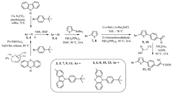 The introduction of a 4-tert-butylphenyl fragment into the dye structure instead of alkyl chains is also one of the ways to provide steric hindrances in order to suppress intermolecular aggregation. Such an approach is presented in [39]. Dyes 11 and 12 contain in their structures 9-(4-tert-butylphenyl)-9H-carbazole or 10-(4-tert-butylphenyl)-10H-phenothiazine fragments connected via a thiophene–phenylene spacer to an electron-withdrawing fragment of cyanoacrylic acid (Scheme 2). A multistep approach was used to synthesize such compounds, including initial N-arylation of the corresponding secondary amine (carbazole or phenothiazine) in the presence of copper salts (Ullmann reaction) or catalyzed by palladium complexes (Buchwald–Hartwig reaction) (Scheme 2).