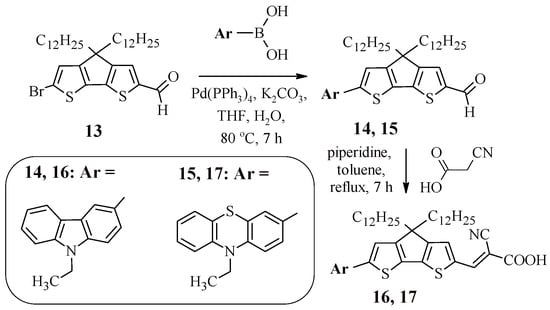 It was found that the use of condensed heterocyclic systems as a π-spacer has a number of advantages over their linearly linked analogs. Namely, such structures enhance light absorption and lead to the suppression of charge recombination [40]. This explains the interest in the synthesis of dyes 16 and 17, containing 4,4-didodecyl-4H-cyclopenta [2,1-b:3,4-b’]dithiophene as a spacer (Scheme 3). The starting carbaldehyde 13 was obtained from 4H-cyclopenta [2,1-b:3,4-b’]dithiophene by sequentially carrying out alkylation, formylation, and bromination reactions.