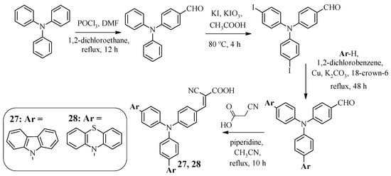 Several approaches to dye design that prevent intermolecular aggregation of dye molecules during solar cell operation have been previously presented, namely the introduction of long alkyl chains or a 4-tert-butylphenyl fragment, as well as the use of a fused heteroaromatic system as a π-spacer. Dyes with a star-shaped structure are also of interest from the point of view of charge recombination suppression. For example, compounds 27 and 28 contain a central triphenylamine core, on the periphery of which there are carbazole or phenothiazine fragments, as well as a cyanoacrylic acid fragment [49]. The Ullmann reaction was used to synthesize these structures, the starting compound for which was 4-[bis(4-iodophenyl)amino]benzaldehyde, obtained in two stages from triphenylamine (Scheme 8).