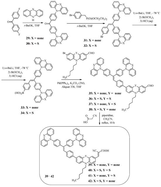 Along with triphenylamine, the introduction of which into the structure of the molecule allows expanding the absorption region and reducing the tendency of aggregation on the TiO2 surface, triphenylethylene is of interest. For example, compounds 39–42 have a star-shaped structure, the central core of which is triphenylethylene connected to terminal carbazole or phenothiazine fragments as well as to the electron-withdrawing fragment of cyanoacrylic acid through electron-donating N-substituted carbazole or phenothiazine bridges (Scheme 9) [50]. The starting compound for the synthesis of these structures was bis(4-fluorophenyl)ketone, which interacted with carbazole or phenothiazine; the products then entered into the Wadsworth–Emmons reaction, which led to the formation of the central triphenylethylene core (31, 32) (Scheme 9). The presence of the bromine atom in compounds 31 and 32 made it possible to obtain the corresponding boric acids 33 and 34 from them, from which carbaldehydes 35–38 were then synthesized under Suzuki reaction conditions. The final stage was the Knoevenagel reaction, which led to the target dyes 39–42.