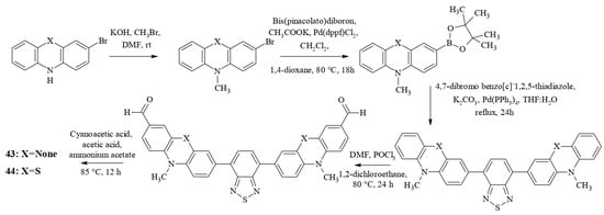 In D-A-π-A-type compounds, an additional electron-withdrawing fragment allows for a significant facilitation of charge transfer from the donor to the acceptor located on the periphery of the molecule, as well as helping to tune the absorption region and HOMO and LUMO levels. In addition, compounds of this type have high photostability [41]. Scheme 4 shows the synthesis of compounds 18 and 19, the carbazole or phenothiazine fragments of which were linked to a cyanoacrylic acid fragment via an additional benzothiadiazole bridge [42,43]. It is worth noting that such structures can be obtained by two different methods. The first method involves carrying out four reactions—the Stille reaction, formylation, the Suzuki reaction, and the Knoevenagel reaction (Method A). The second method reduces the number of steps to three and involves a sequence of two Suzuki reactions, the final product of which, when reacted with cyanoacetic acid in chloroform with a catalytic amount of piperidine, leads to the formation of compounds 18 and 19 (Method B).