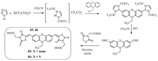 An alternative approach to the Vilsmeier–Haack reaction, in which the starting dicarbaldehydes were obtained in two stages, was used to synthesize these structures. Initially, the reaction product of imidazole with trifluoroacetic anhydride interacted with N-substituted carbazole or phenothiazine to form intermediate compounds containing trifluoroacetyl groups, the further hydrolysis of which led to the production of dicarbaldehydes. The final stage of the synthesis of compounds 45 and 46 was the Knoevenagel reaction.
