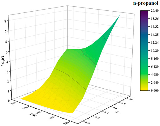 The solubility data for erythromycin thiocyanate dihydrate in water–methanol and water–n-propanol binary mixtures are provided in Table 2 and Table 3, respectively. Two-dimensional solubility curves for erythromycin thiocyanate dihydrate in the binary solvent systems at varying ratios were generated to analyze its solubility behavior, as depicted in Figure 4 and Figure 5.