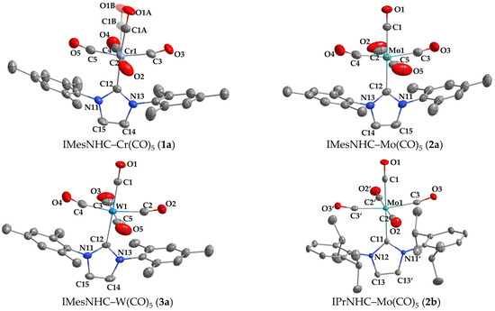 Another aspect of our research focused on the crystallization and the structural characterization of compounds that have not yet been structurally characterized. As far as we know, only a few crystal structures of the NHC-stabilized group VI metal carbonyls have been described in the literature [14,15,16]. More specifically, of the compounds we are interested in, only two examples with IPrNHC carbenes have been described so far (IPrNHC–Cr(CO)5 [7] and IPrNHC–W(CO)5 [17]).