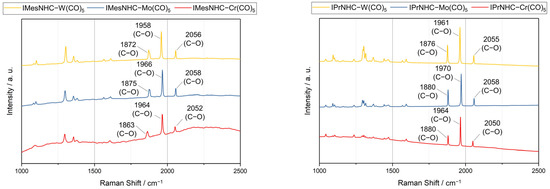 Raman spectroscopy was used for the characterization of the compounds as an alternative method to IR spectroscopy. The complete Raman spectra of the prepared compounds can be found in the Supporting Information. Figure 2 shows the spectra of NHC–M(CO)5 (NHC = IMesNHC, IPrNHC; M = Cr, Mo, W) with the assigned C–O vibrations.