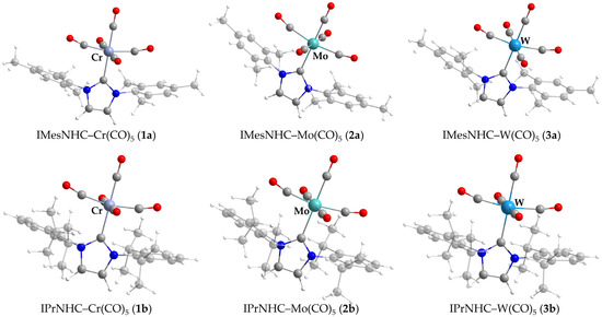 The following supporting information can be downloaded at: https://www.mdpi.com/article/10.3390/molecules30112433/s1, Figure S1. 1H NMR spectrum of IMesNHC–Cr(CO)5 (1a) in C6D6 solution; Figure S2. 13C NMR spectrum of IMesNHC–Cr(CO)5 (1a) in C6D6 solution; Figure S3. 1H NMR spectrum of IMesNHC–Mo(CO)5 (2a) in C6D6 solution; Figure S4. 13C NMR spectrum of IMesNHC–Mo(CO)5 (2a) in C6D6 solution; Figure S5. 1H NMR spectrum of IMesNHC–W(CO)5 (3a) in C6D6 solution; Figure S6. 13C NMR spectrum of IMesNHC–W(CO)5 (3a) in C6D6 solution; Figure S7. 1H NMR spectrum of IPrNHC–Cr(CO)5 (1b) in C6D6 solution; Figure S8. 13C NMR spectrum of IPrNHC–Cr(CO)5 (1b) in C6D6 solution; Figure S9. 1H NMR spectrum of IPrNHC–Mo(CO)5 (2b) in C6D6 solution; Figure S10. 13C NMR spectrum of IPrNHC–Mo(CO)5 (2b) in C6D6 solution; Figure S11. 1H NMR spectrum of IPrNHC–W(CO)5 (3b) in C6D6 solution; Figure S12. 13C NMR spectrum of IPrNHC–W(CO)5 (3b) in C6D6 solution; Table S1. Comparison of 13C NMR peaks in compounds NHC–M(CO)5 (NHC = IMesNHC, IPrNHC; M = Cr, Mo, W) in C6D6 with similar compounds from literature; Figure S13. Raman spectra of IMesNHC–Cr(CO)5 (1a), IMesNHC–Mo(CO)5 (2a), and IMesNHC–W(CO)5 (3a); Figure S14. Raman spectra of IPrNHC–Cr(CO)5 (1b), IPrNHC–Mo(CO)5 (2b), and IPrNHC–W(CO)5 (3b); Table S2. Calculated enthalpies (H) at the PBE/def2TZVP level of theory and calculated enthalpies of reactions ΔH in a.u. and kJ/mol; Table S3. Calculated Gibbs free energies (G) at the PBE/def2TZVP level of theory and calculated Gibbs free energies of reactions ΔG in a.u. and kJ/mol. Table S4. Selected crystal data for IMesNHC–Cr(CO)5 (1a) and IMesNHC–Mo(CO)5·MeCN (2a·MeCN); Table S5. Selected crystal data for IMesNHC–W(CO)5·MeCN (3a·MeCN) and IPrNHC–Mo(CO)5 (2b); Table S6. Selected bond lengths (Å) and bond angles (o) for IMesNHC–Cr(CO)5 (1a); Table S7. Selected bond lengths (Å) and bond angles (o) for IMesNHC–Mo(CO)5·MeCN (2a·MeCN); Table S8. Selected bond lengths (Å) and bond angles (o) for IMesNHC–W(CO)5·MeCN (3a·MeCN); Table S9. Selected bond lengths (Å) and bond angles (o) for IPrNHC–Mo(CO)5 (2b); Figure S15. Asymmetric unit of IMesNHC–Cr(CO)5·MeCN (1a·MeCN); Figure S16. Asymmetric unit of IMesNHC–Mo(CO)5·MeCN (2a·MeCN); Figure S17. Asymmetric unit of IMesNHC–W(CO)5·MeCN (3a·MeCN).