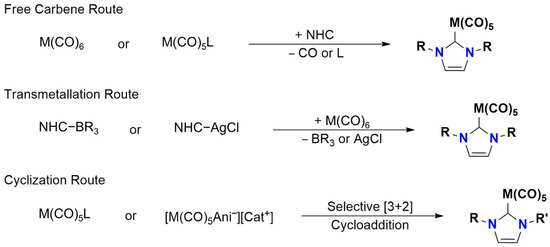 Known synthetic routs to NHCM(CO)5 (M = Cr, Mo, W). L = neutral ligand; Ani− = anionic ligand; Cat+ = Cation.