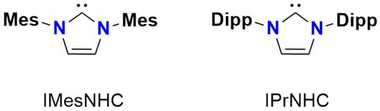 - Jafarpour, L.; Stevens, E.D.; Nolan, S.P. A Sterically Demanding Nucleophilic Carbene: 1,3-Bis(2,6-Diisopropylphenyl)Imidazol-2-Ylidene). Thermochemistry and Catalytic Application in Olefin Metathesis. J. Organomet. Chem. 2000, 606, 49–54. [Google Scholar] [CrossRef]
