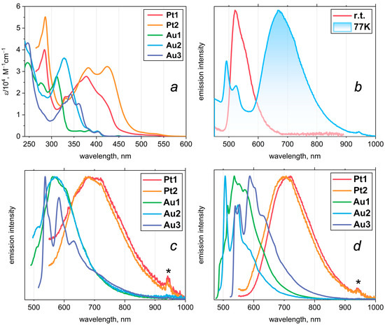 - Luginin, M.; Snetkov, D.; Sizova, A.; Paderina, A.V.; Sizov, V.; Grachova, E.V. Cyclometalated Au(III) complexes with alkynylphosphine oxide ligands: Synthesis and photophysical properties. Dalton Trans. 2025, 54, 2950–2963. [Google Scholar] [CrossRef] [PubMed]