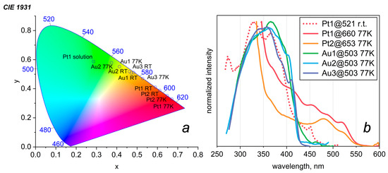 - Tang, M.C.; Chan, A.K.W.; Chan, M.Y.; Yam, V.W.W. Platinum and Gold Complexes for OLEDs. Top. Curr. Chem. 2016, 374. [Google Scholar] [CrossRef] [PubMed]
