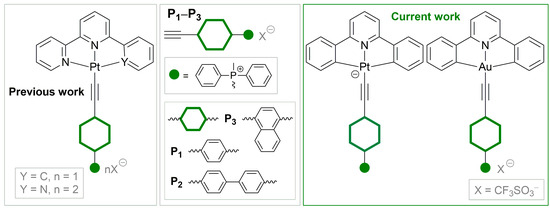 - Yim, K.C.; Au, V.K.M.; Wong, K.M.C.; Yam, V.W.W. Luminescent Bis-Cyclometalated Gold(III) Complexes with Alkynyl Ligands of Hexaphenylbenzene and Hexabenzocoronene Derivatives and Their Supramolecular Assembly. Chem.—A Eur. J. 2017, 23, 5772–5786. [Google Scholar] [CrossRef]