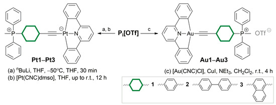 - Yam, V.W.W.; Wong, K.M.C.; Hung, L.L.; Zhu, N. Luminescent gold(III) alkynyl complexes: Synthesis, structural characterization, and luminescence properties. Angew. Chem. Int. Ed. 2005, 44, 3107–3110. [Google Scholar] [CrossRef]