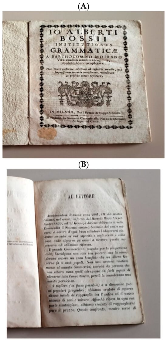 The two heritage books examined in this study. Panel (A): XVI century book. Written by Gian Alberto Bossi, this Latin grammar became a bestseller and was widely used by teachers instructing students from noble families. Preserved in Busto Arsizio, it remains relevant today, with examples still used in modern classrooms. Panel (B): XIX century book. This 1860 book on mathematical conversions, acquired at an antique market, was widely used in early post-unification Italy to standardize local measurements according to the new national system.