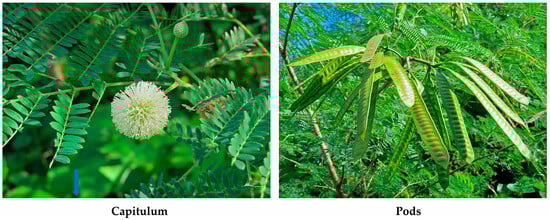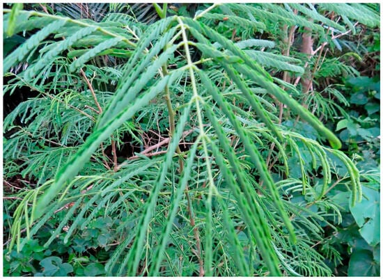 Leucaena leucocephala (Lam.) de Wit, belonging to the Fabaceae family, is a perennial tree, 3–10 m, rarely 20 m, in height, with a cylindrical stem of 5–50 cm in diameter and branched. The leaves are alternate and bipinnate, consisting of 4–9 pairs of pinnae per leaf, and 13–21 pairs of leaflets per pinna [1,2,3,4]. The lifespan of L. leucocephala is over 30 years [5], and the annual biomass productivity has been estimated to be at 20–60 tons per hectare in the tropical regions [6] (Figure 1).