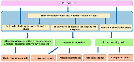 Mimosine is toxic to herbivorous mammals and insects, parasitic nematodes, pathogenic fungi, and competing plant species e.g., [79,124,132,142,150]. L. leucocephala contains high levels of mimosine in the entire plant [81,82,83]. Consumption of the plant parts and the administration of mimosine cause various pathological symptoms, including alopecia, cataracts, hepatic congestion, goiter, increases in the infertility, abortion, and abnormal embryo development in female mammals, and decrease in the serum testosterone levels in male mammals. These symptoms caused by mimosine may be due to the inactivation of several essential enzymes and the blockade of DNA replication [94,95,96,97,98,99,100,101,102,103,104,105,106,107,108,109,110,111,112,113]. Mimosine increases the mortality of insects and parasitic nematodes, and suppresses the growth of pathogenic fungi e.g., [123,124,132,150]. The activity of acetylcholinesterase and tyrosinase in insects was also suppressed by mimosine application [124]. In addition, mimosine acts as an allelochemical, inhibiting the growth of the competing plant species by blocking DNA replication and causing oxidative stress conditions [81,183] (Figure 6).