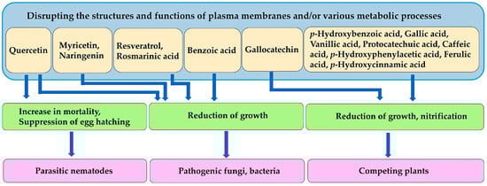 Quercetin exhibits nematocidal activity, inhibiting egg hatching, and increasing nematode mortality [143]. Benzoic acid, flavonoids, such as quercetin, naringenin, and myricetin, and polyphenolic compounds, such as rosmarinic acid and resveratrol, are toxic to pathogenic fungi and bacteria [151]. Several benzoic and cinnamic acid derivatives, including p-hydroxybenzoic acid, gallic acid, vanillic acid, protocatechuic acid, p-hydroxyphenylacetic acid, p-hydroxycinnamic acid, caffeic acid, and ferulic acid, act as allelochemicals, and inhibit the growth of neighboring competing plant species [183]. Gallocatechin suppresses the nitrification process by inhibiting related bacterial activity, reducing nitrate availability in the soil, and causing the growth suppression of neighboring plant species [216]. These compounds may cause the inhibition by disrupting the structures and functions of plasma membranes and/or various metabolic processes (Figure 7).