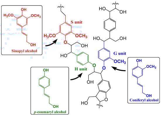 Lignin is a complex organic biopolymer found in the plant cell walls, providing rigidity and resistance to decay. It is an abundant byproduct of the pulp and paper industry (~50 million tons of lignin), ethanol and textile industry (~30 million tons of lignin), and the agricultural sector [1,2]. However, less than 2% of lignin from these sources is currently utilized, with the remaining predominantly burned as low-cost fuel, raising significant environmental concerns [3,4,5]. Therefore, converting lignin into value-added products is crucial for addressing future economic and ecological challenges. Lignin is mainly composed of monolignol units [p-hydroxyphenyl (H), guaiacyl (G), and syringyl (S)]. interconnected through aryl ether or carbon–carbon bonds to form their three-dimensional (3D) network (Figure 1) [6]. The various functionalized aromatic groups present in lignin make it a promising candidate to replace petrochemicals. Additionally, lignin is naturally hydrophilic, and its rigid structure imparts unique properties to polymer matrices.