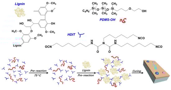Chen et al. developed a lignin-based PU coating with anti-smudge and anti-UV properties in their study [61]. Lignin-based coatings (lig-PU-PDMS) were prepared using lignin as polyols, hexamethylene diisocyanate trimer (HDIT) as the crosslinking agent, and a small amount of monocarbinol-terminated poly-dimethylsiloxane (PDMS-OH) as the dewetting agent (Figure 2). The hardness (HIT) and elastic modulus (EIT) of lig-PU-PDMS coatings were measured by nanoindentation. When the PDMS-OH content increased from 0 to 5.0 wt.%, HIT decreased from 260.1 to 226.8 MPa, and EIT decreased from 4.7 to 4.1 GPa. After 400 h of UV aging, the HIT and EIT of lig-PU-PDMS (0 wt.%) increased by 16.9% and 16.1%, respectively, while those of lig-PU-PDMS (5.0 wt.%) increased by only 11.9% and 10.9%. Moreover, the coatings maintained good mechanical properties even after UV aging, with lignin protecting the PU from UV damage. The aromatic skeleton and conjugated structure of lignin provide the coatings with extraordinary UV-blocking capability and increase the strength of the PU coating. However, the study focused on a specific lignin type, indicating that further research may be necessary to adjust the process for other lignin sources.