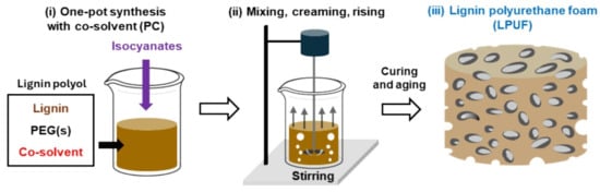 Illustration of the one-pot synthesis of lignin polyurethane foam using a co-solvent [62]. Used with permission, copyright 2024 Elsevier.