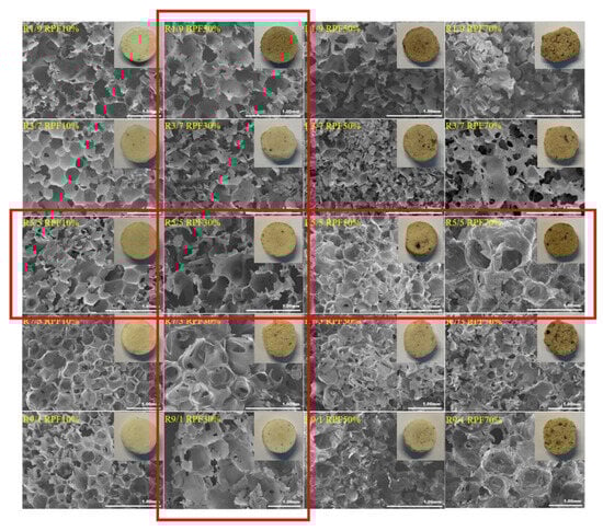 SEM images of RPFs synthesized using catalytic upstream biorefining (CUB) lignin oligomers as polyol substitutes [64]. Used with permission, copyright 2023 Elsevier.