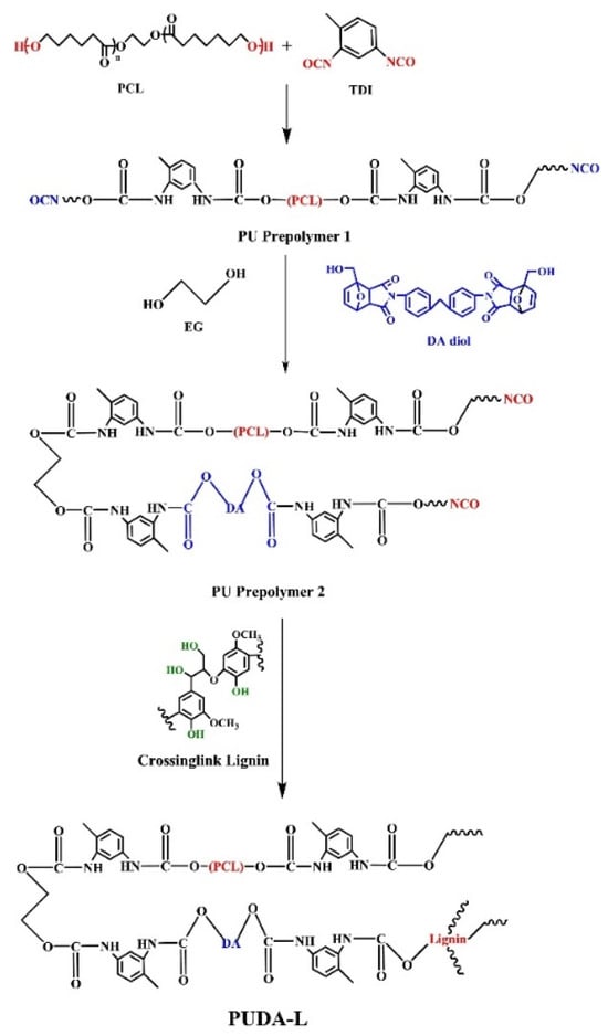 Preparation method of lignin self-healing polyurethane elastomer (PUDA-L) [65]. Used with permission, copyright 2023 Elsevier.