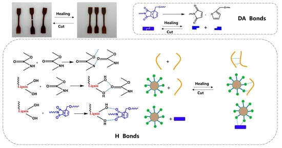 - Du, J.; Wang, H.; Huang, Z.; Liu, X.; Yin, X.; Wu, J.; Lin, W.; Lin, X.; Yi, G. Construction and mechanism study of lignin-based polyurethane with high strength and high self-healing properties. Int. J. Biol. Macromol. 2023, 248, 125925. [Google Scholar] [CrossRef]