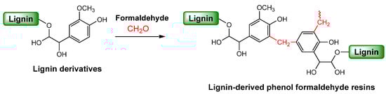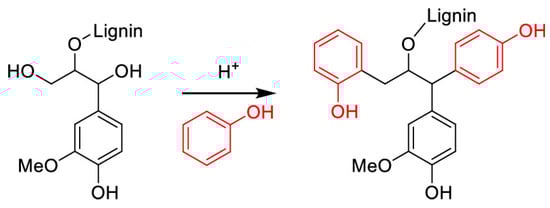 The replacement of aliphatic hydroxyl groups by ortho-/para-bound phenol through acid-catalyzed phenolation of lignin [66]. Used with permission, copyright 2024 American Chemical Society.