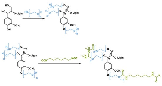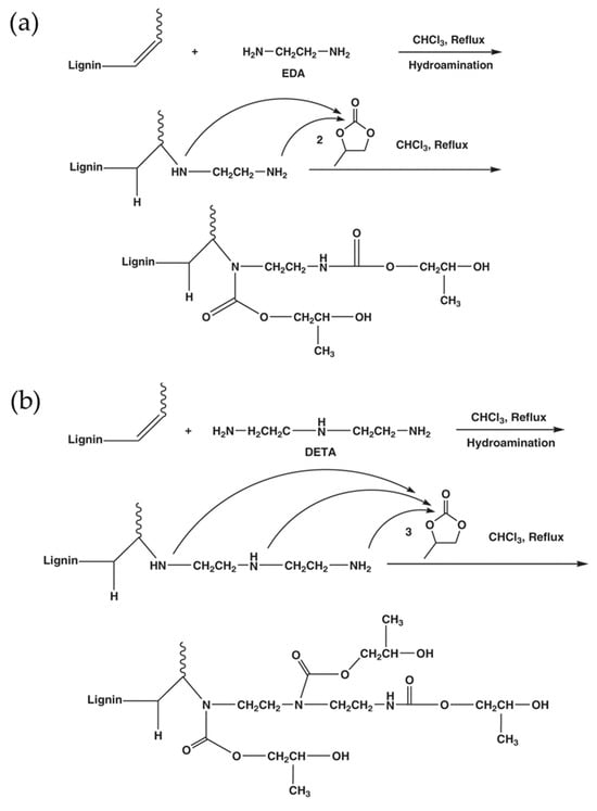The reaction of (a) ethylene diamine (EDA) and (b) diethylenetriamine (DETA) with unsaturated regions of lignin, followed by the reaction of aminated lignin with propylene carbonate to produce lignin-based polyols [70]. Under a Creative Commons Attribution (CC BY) license (https://creativecommons.org/licenses/by/4.0/ accessed on 27 April 2025).
