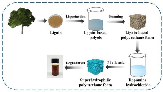 Oily wastewater poses significant environmental challenges and is produced across various sectors, including oil refining, food processing, automotive maintenance, shipping, construction, metalworking, and oil extraction [75,76]. Foams are one of the ideal solutions to separate oil from water due to their variable porosity and lightweight properties. Chen and coworkers enzymatically hydrolyzed lignin and liquefied it into a lignin-based polyol. Then, polyols were reacted with diisocyanate to produce synthesized lignin-based polyurethane foam (LPUF) [68]. The LPUF was further modified by in situ polymerization of dopamine on the foam surface under weakly alkaline conditions to deposit polydopamine (PDA) particles, followed by surface modification using phytic acid (PA) to prepare LPUF/PDA/PA foams (Figure 10). LUPF was degraded entirely in an alkali medium within 5 h, which was attributed to the presence of lignin. The LPUF/PDA/PA exhibited excellent superhydrophilicity with a water contact angle of 0° and underwater superoleophobicity with oil contact angles exceeding 150°, achieving over 99% oil–water separation efficiency for various mixtures while maintaining high performance after ten cycles. Additionally, it demonstrated good adsorption capacities for methylene blue (67.1 mg/g), rhodamine B (96.1 mg/g), and copper sulfate (98.2 mg/g) and could completely degrade under weak alkaline conditions after use. However, some limitations of LPUFs include challenges in scalability, durability, complex fabrication processes, limited versatility, potential environmental degradation, and chemical leaching, demanding further research to enhance their performance and sustainability.