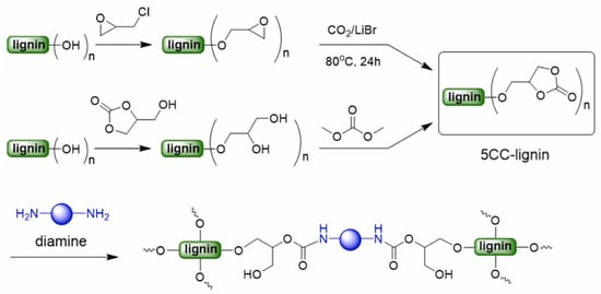 Due to the high toxicity associated with isocyanates, there is a growing demand for developing and producing non-isocyanate polyurethanes (NIPUs) as a safer and more sustainable alternative to traditional PUs [77,78]. There are several methods to prepare NIPUs. Among them, aminolysis of cyclic carbonates (CCs) are more interesting because this approach involves the nucleophilic ring-opening reaction of CCs with amines, forming urethane linkages through a straightforward and non-toxic process. This process can be further enhanced by introducing five-membered cyclic carbonate groups (5CCs) into lignin or by depolymerizing lignin derivatives through glycidylation, followed by cycloaddition with CO2 or oxyalkylation with glycerol carbonate to incorporate adjacent hydroxyl groups (Figure 11) [69]. Subsequently, transesterification with dimethyl carbonate allows the production of a series of NIPUs via the polyaddition of cyclic carbonate-functionalized lignin and diamines.