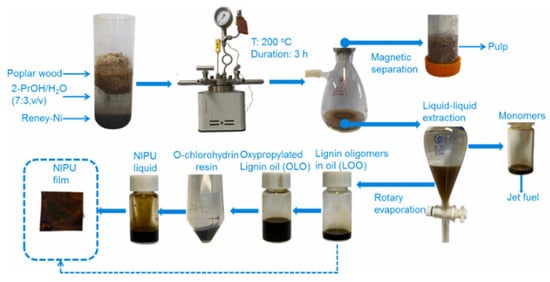 Preparation pathway of NIPU films from the lignin oligomers in the RCF oil [69]. Used with permission, copyright 2023 Elsevier.