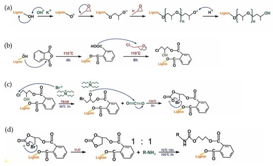 (a) The mechanism of oxypropylation reaction, (b) o-chlorohydrin resin formation (c) cyclic carbonation, and (d) NIPUs synthesis [69]. Used with permission, copyright 2023 Elsevier.