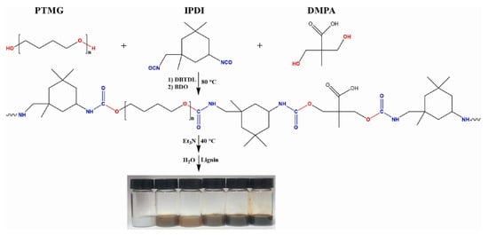 Preparation procedure of various lignin-based WPU emulsions [73]. Under a Creative Commons Attribution (CC BY) license (https://creativecommons.org/licenses/by/4.0/ accessed on 27 April 2025).