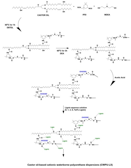 Schematic illustration of the preparation mechanism for castor oil-based cationic waterborne polyurethane incorporating lignin [74]. Under a Creative Commons Attribution (CC BY) license (https://creativecommons.org/licenses/by/4.0/ accessed on 27 April 2025).