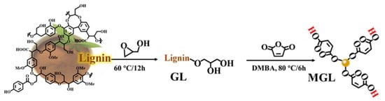 Lignin modification to synthesize glycidylated lignin (GL) and multicarboxyl lignin (MGL) [82]. Used with permission, copyright 2023 American Chemical Society.