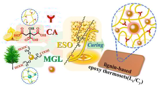 Preparation procedure for lignin-based epoxy thermosets (Lx/Cy) [82]. Used with permission, copyright 2023 American Chemical Society.