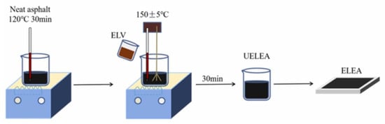 Conventional epoxy asphalt is a thermosetting material that is difficult to recycle [96]. Song et al. developed a lignin-based vitrimer system (ELV) to replace conventional epoxy asphalt, incorporating dynamic covalent ester-exchange bonds for recyclability [83]. Enzymatic lignin (EL) was reacted with epichlorohydrin (ECH) under alkaline conditions to obtain lignin epoxy resin (LER). EL was esterified with maleic anhydride (MA) to obtain carboxylated lignin (EL-COOH). The lignin-based vitrimer system (ELV) was prepared by the Zn2+ catalyzed reaction of LER and EL-COOH in the presence of polyethylene glycol 400 (PEG 400). ELV (10–30 wt.%) was then introduced into base asphalt to produce different lignin-based epoxy asphalt systems (ELEA, Figure 20). ELEA exhibited improved high-temperature stability, with a higher softening point as ELV content increased. The glass transition temperature (Tg) remained stable (8–10 °C), ensuring good low-temperature performance. ELEA-20 (20 wt.% of ELV) showed comparable thermal stability to base asphalt (initial decomposition at 287 °C) and higher maximum decomposition temperature (470 °C vs. 454 °C). ELEA-20 met tensile strength (>1.5 MPa) and elongation at break (>200%) requirements for steel bridge deck pavement. Increasing ELV content enhanced tensile strength but reduced ductility. The dynamic covalent bonds in ELEA enable high-temperature restructuring, offering potential for recovery and recycling.