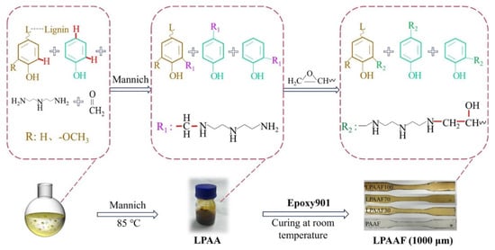 Preparation of lignin-based phenolic amine (LPAA) and epoxy resin (LPAAF) [85]. Used with permission, copyright 2023 Elsevier.