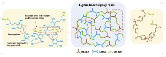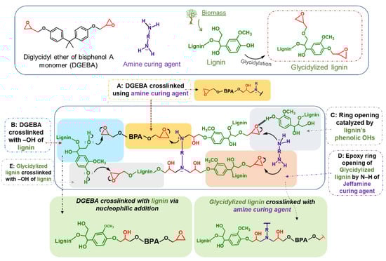 Proposed mechanism for crosslinking of lignin/DGEBA/diamine to prepare epoxy resins [86]. Used with permission, copyright 2023 Elsevier.