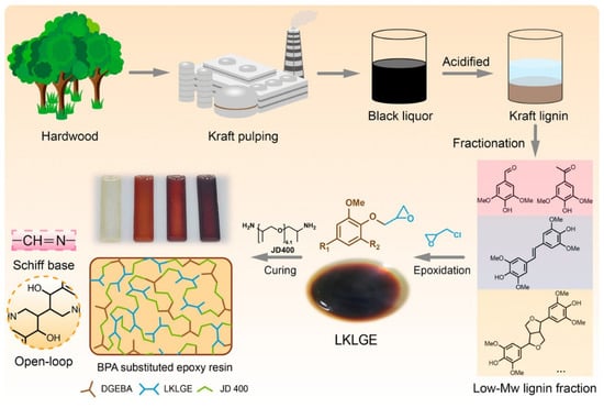 Preparation procedure of lignin-based epoxy resin using low-molecular-weight lignin glycidyl ether (LKLGE) [87]. Used with permission, copyright 2023 American Chemical Society.