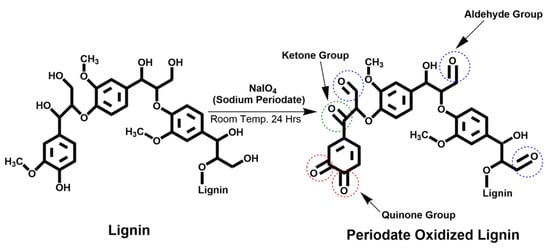 - Bansode, A.; Portilla Villarreal, L.A.; Wang, Y.; Asafu-Adjaye, O.; Via, B.K.; Farag, R.; Vega Erramuspe, I.B.; Auad, M.L. Kraft Lignin Periodate Oxidation for Biobased Wood Panel Resins. ACS Appl. Polym. Mater. 2023, 5, 4118–4126. [Google Scholar] [CrossRef]