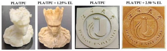 - Murillo-Morales, G.; Sethupathy, S.; Zhang, M.; Xu, L.; Ghaznavi, A.; Xu, J.; Yang, B.; Sun, J.; Zhu, D. Characterization and 3D printing of a biodegradable polylactic acid/thermoplastic polyurethane blend with laccase-modified lignin as a nucleating agent. Int. J. Biol. Macromol. 2023, 236, 123881. [Google Scholar] [CrossRef]
