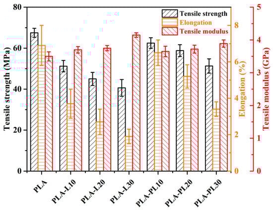 - Ju, Z.; Brosse, N.; Hoppe, S.; Wang, Z.; Ziegler-Devin, I.; Zhang, H.; Shu, B. Thermal and mechanical properties of polyethylene glycol (PEG)-modified lignin/polylactic acid (PLA) biocomposites. Int. J. Biol. Macromol. 2024, 262, 129997. [Google Scholar] [CrossRef]