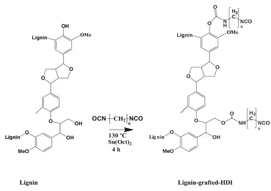 Lignin modification and preparation procedure of lignin-based polyurethane [67]. Used with permission, copyright 2024 American Chemical Society.