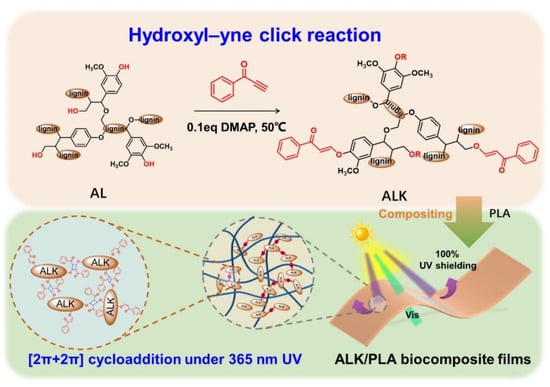 - Li, B.; Zhu, X.; Xu, C.; Zhang, X.; Fan, Y.; Yu, J. Sustainable strategy for lignin etherification and its promotion of anti-UV aging PLA biocomposite. Chem. Eng. J. 2024, 500, 156746. [Google Scholar] [CrossRef]