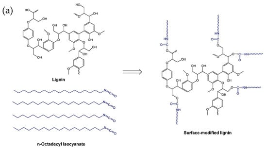 Due to its aromatic hydroxyl functionalities and abundant π–π conjugation, lignin offers biocompatibility, flame retardancy, UV resistance, antibacterial and antioxidant activities, thermal stability, and the ability to modify mechanical properties [7,8,9]. These characteristics have made lignin the focus of numerous studies and reviews, highlighting its versatility as a polymer additive. It has been successfully incorporated into lignin-derived polyurethanes (PUs), epoxy resins, phenol-formaldehyde resins, polyesters, polylactic acid (PLA), bio-based fillers, additives, films, coatings, stimuli-responsive, and biomedical materials [10,11,12,13,14,15,16,17,18,19,20,21,22]. The incorporation of lignin in these materials offers a more sustainable and often higher-performing alternative to their petrochemical-based counterparts [23,24].