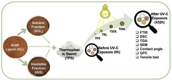 - Rodrigues, J.S.; de Freitas, A.d.S.M.; Lopes, H.S.M.; Pires, A.A.F.; Lemes, A.P.; Ferreira, M.; Botaro, V.R. Improvement of UV stability of thermoplastic starch matrix by addition of selected lignin fraction—Photooxidative degradation. Int. J. Biol. Macromol. 2023, 230, 123142. [Google Scholar] [CrossRef]