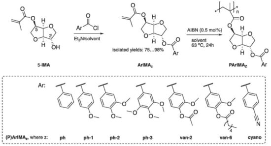 - Laanesoo, S.; Bonjour, O.; Sedrik, R.; Tamsalu, I.; Jannasch, P.; Vares, L. Combining isosorbide and lignin-related benzoic acids for high-Tg polymethacrylates. Eur. Polym. J. 2024, 202, 112595. [Google Scholar] [CrossRef]